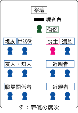 葬儀の席次は通夜と同じで、祭壇に向かって右側に遺族、左側に世話役や友人・知人が並びます。